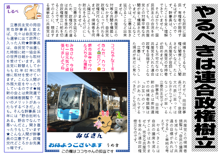 道しるべ 立憲民主党の岡田克也幹事長と言えば、元々は自民党から選挙に出て政界に入った人物★幹事長は、自民党で当選した時期に統一協会系の世界日報から取材を受けています。民主党に鞍替えしてからも01年02年に同様に取材を受けています。こんな人間が外務大臣をやったりしているのです★維新の会とは衆院選での候補者調整で「互いのメリットがあったらするべきだ」とも。そんな幹事長16年には「野合批判もある。野合でなんで悪いんだと」開き直ったりもしています★こんな人間が幹事長の立憲です。政権交代どころかお先真っ暗です。