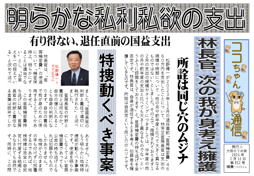 道しるべ 政治と金が紛糾する中にあって、その当事者である松野博一が支出していた巨額の官房機密費★これはもう、うやむやにして済まされることではありません。徹底的な解明によって処罰されるべき事案です★松野は「歴代内閣ずっと同じ形で法律にのっとってされているものでありますから」と自身の官房機密費持ち逃げを正当化しています。確かに歴代に渡ってそうでしょう★歴代の官房長官が繰り返してきた官房機密費の持ち逃げです。しかし、今回の場合はさらに悪質です。パー券裏金事件で渦中にあった松野による公金持ち逃げなのです。