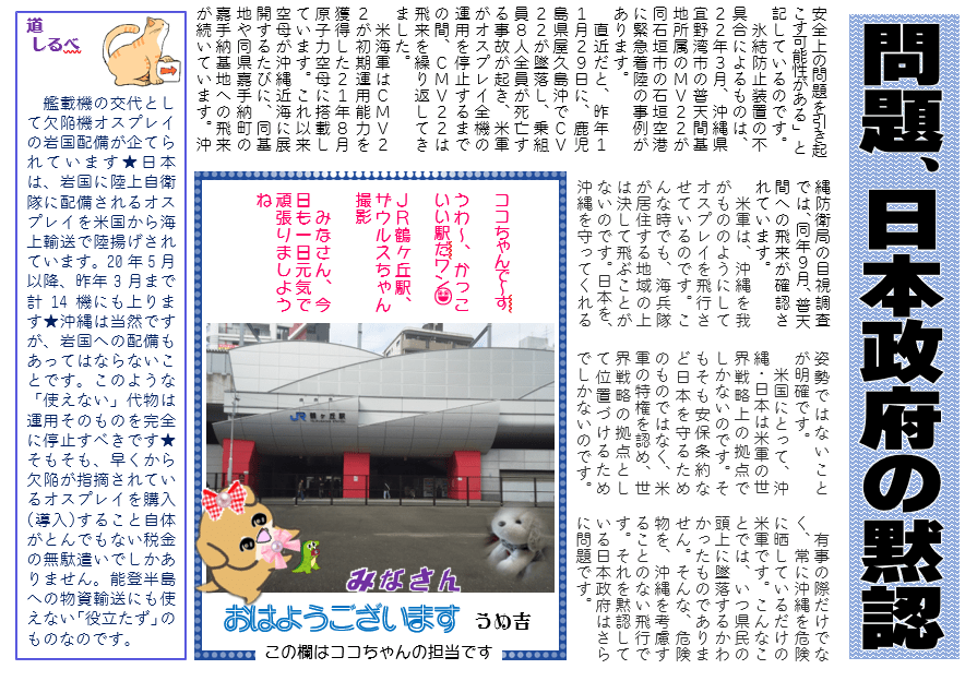 道しるべ 艦載機の交代として欠陥機オスプレイの岩国配備が企てられています★日本は、岩国に陸上自衛隊に配備されるオスプレイを米国から海上輸送で陸揚げされています。20年5月以降、昨年3月まで計14機にも上ります★沖縄は当然ですが、岩国への配備もあってはならないことです。このような「使えない」代物は運用そのものを完全に停止すべきです★そもそも、早くから欠陥が指摘されているオスプレイを購入(導入)すること自体がとんでもない税金の無駄遣いでしかありません。能登半島への物資輸送にも使えない「役立たず」のものなのです。