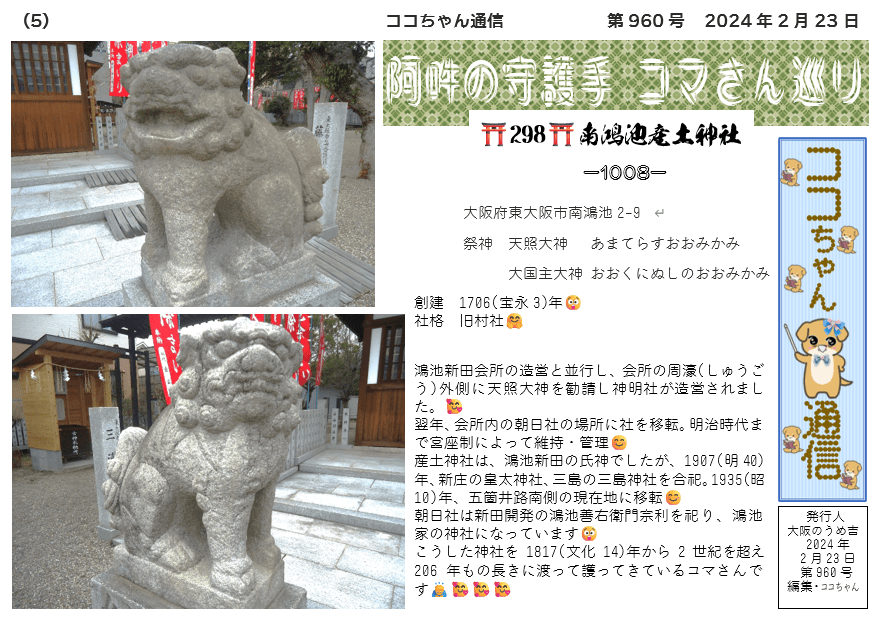 産土神社は、鴻池新田の氏神でしたが、1907(明40)年、新庄の皇太神社、三島の三島神社を合祀。1935(昭10)年、五箇井路南側の現在地に移転😊