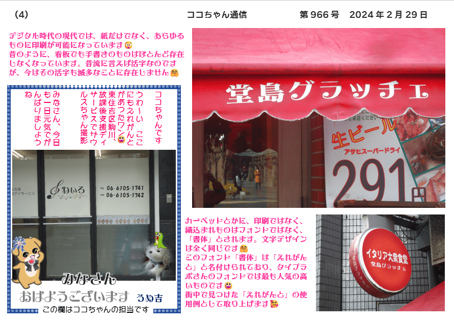昔のように、看板でも手書きのものはほとんど存在しなくなっています。昔流に言えば活字なのですが、今はその活字も滅多なことに存在しません🤗