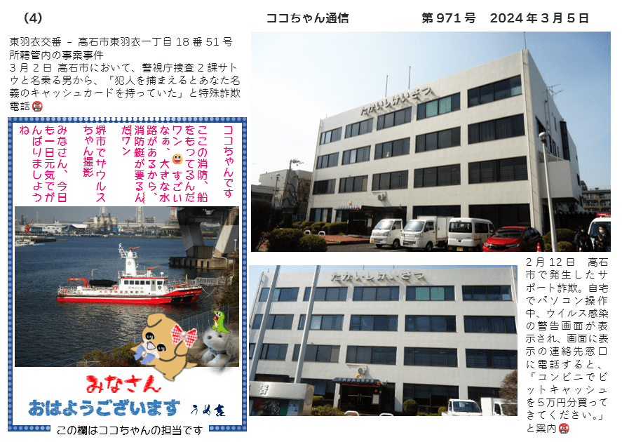 3月2日 高石市において、警視庁捜査2課サトウと名乗る男から、「犯人を捕まえるとあなた名義のキャッシュカードを持っていた」と特殊詐欺電話🤬