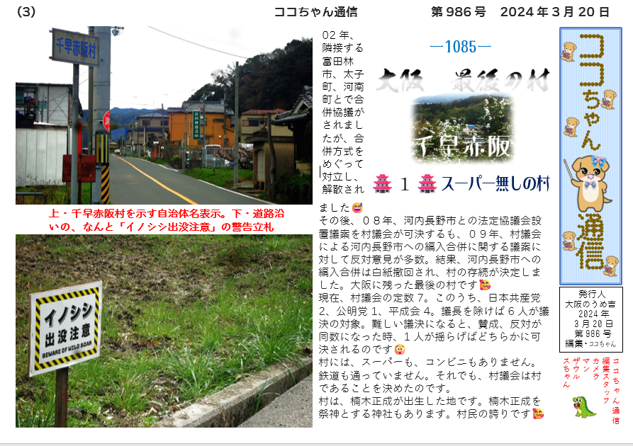 その後、08年、河内長野市との法定協議会設置議案を村議会が可決するも、09年、村議会による河内長野市への編入合併に関する議案に対して反対意見が多数。結果、河内長野市への編入合併は白紙撤回され、村の存続が決定しました。大阪に残った最後の村です🥰