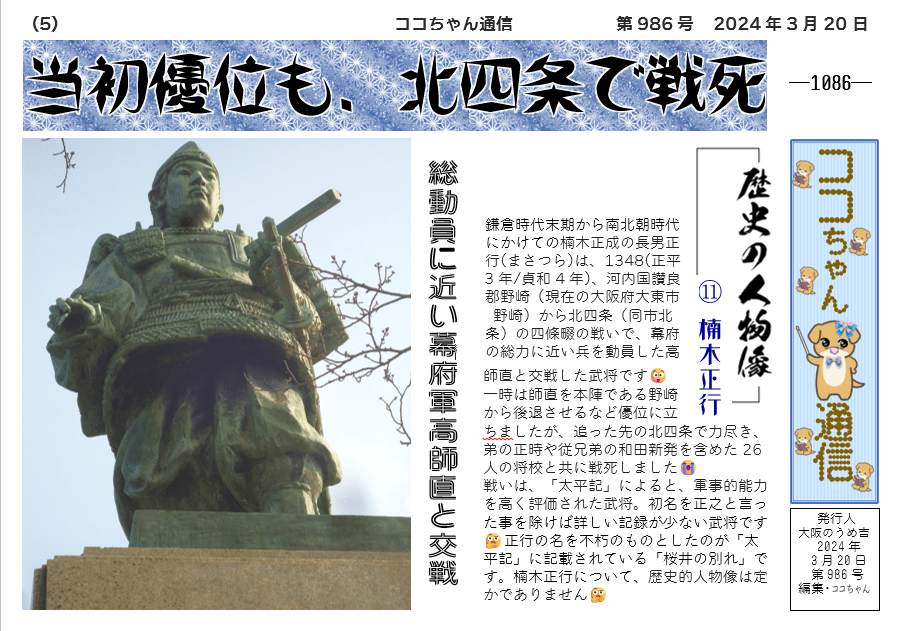 鎌倉時代末期から南北朝時代にかけての楠木正成の長男正行(まさつら)は、1348(正平3年/貞和4年)、河内国讃良郡野崎(現在の大阪府大東市野崎)から北四条(同市北条)の四條畷の戦いで、幕府の総力に近い兵を動員した高師直と交戦した武将です😲
