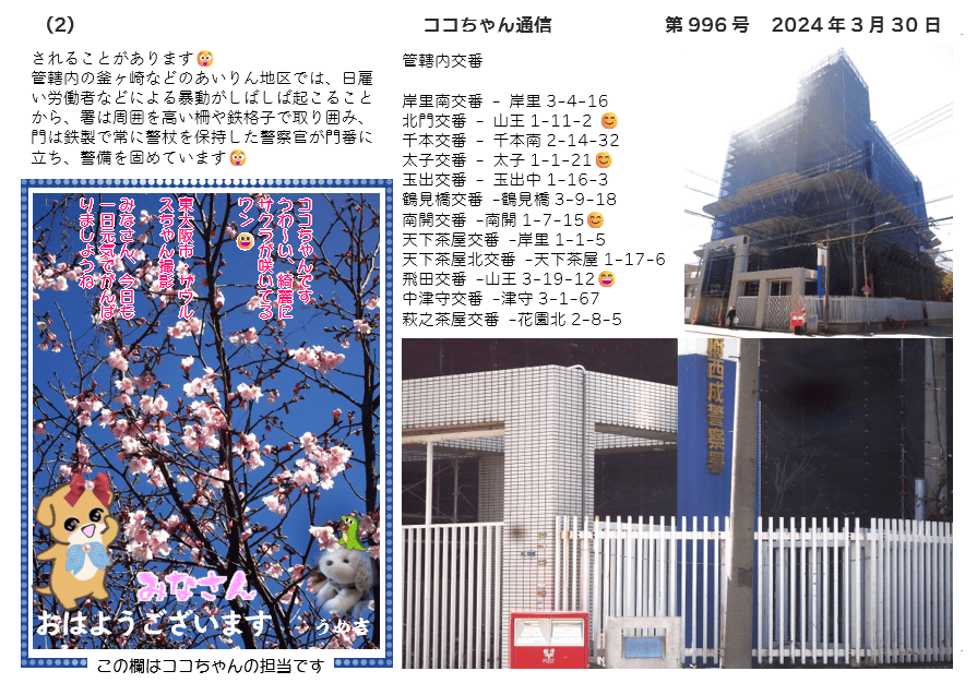 府警管轄の署の一つ。管轄区域は大阪市西成区。管内にはあいりん地区があり日本三大寄せ場が存在しています。これらエリアを中心に治安悪化が常態化しています😫