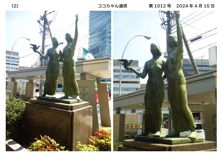 公園・てんしばにある「はばたけ平和の空へ」と題した女性ふたりと手にのる鳩の像です🕊️