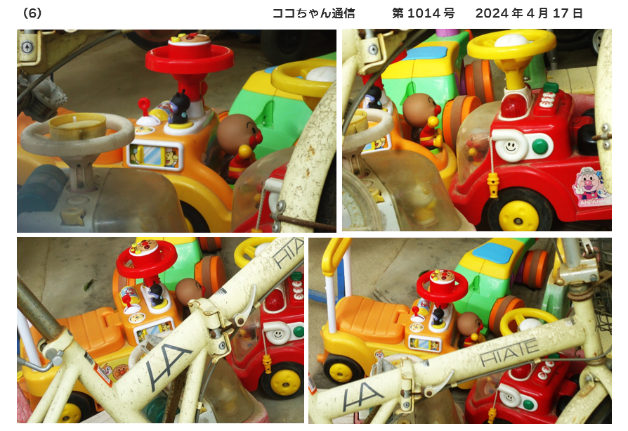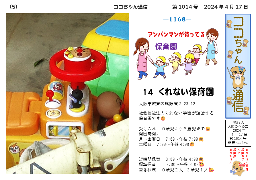 くれない保育園、正面ガードのところにアンパンマンの乗り物が置かれています
