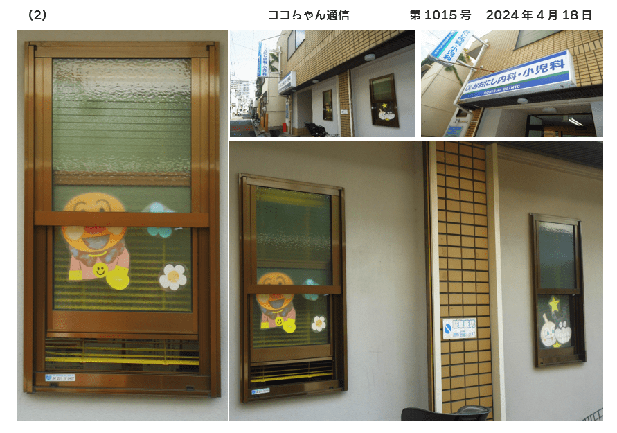 建物の前、窓にアンパンマンとそのキャラを描いたものを切り取って張られています😃