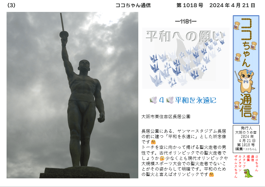 長居公園にある、ヤンマースタジアム長居の前に建つ「平和を永遠に」とした祈念像です🤗