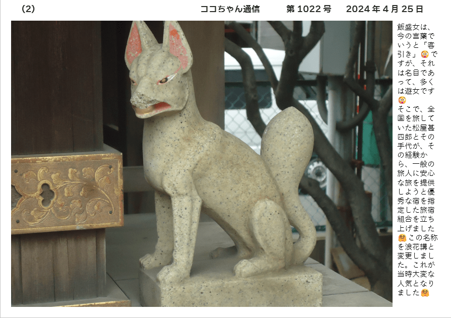 そこで、全国を旅していた松屋甚四郎とその手代が、その経験から、一般の旅人に安心な旅を提供しようと優秀な宿を指定した旅宿組合を立ち上げました🤗この名称を浪花講と変更しました。これが当時大変な人気となりました🤗