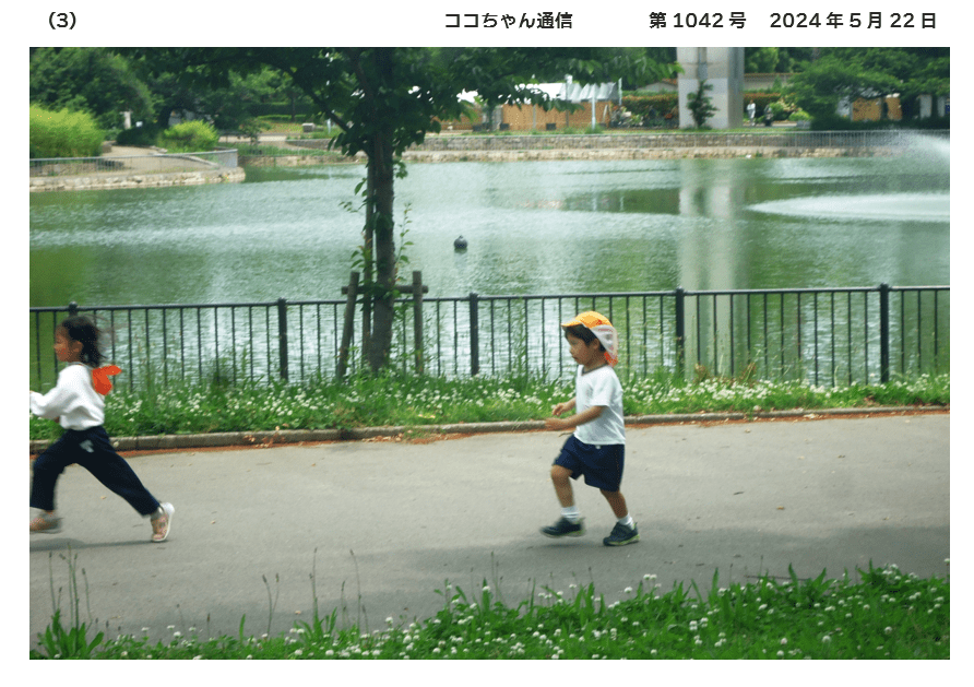 近くの保育園の子どもたちです。保育士さんに引率されての園外保育。2人ひと組になってのかけっこ。元気にゴールに向かって走る園児です🤗(ザウルスちゃん撮影)