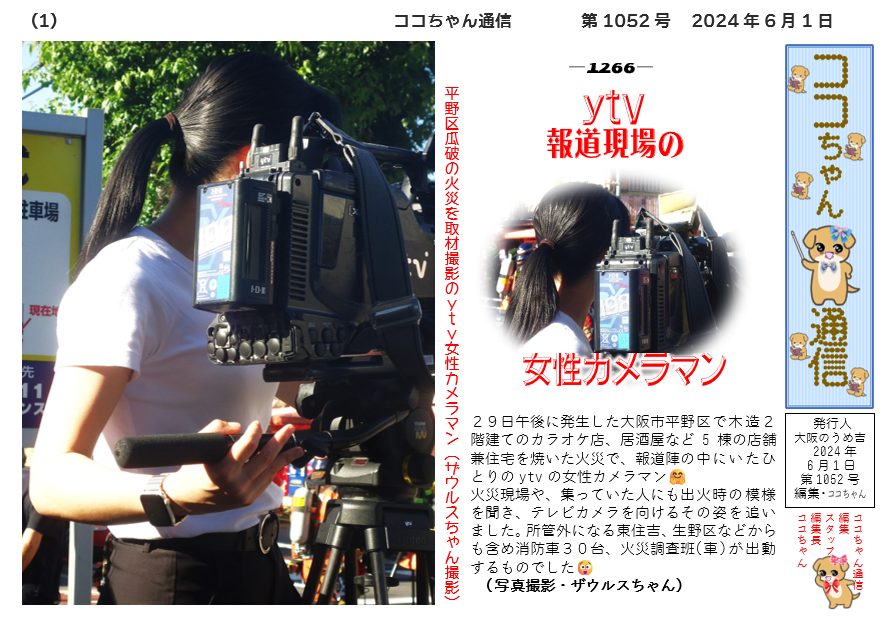 29日午後に発生した大阪市平野区で木造2階建てのカラオケ店、居酒屋など5棟の店舗兼住宅を焼いた火災で、報道陣の中にいたひとりのytvの女性カメラマン🤗
