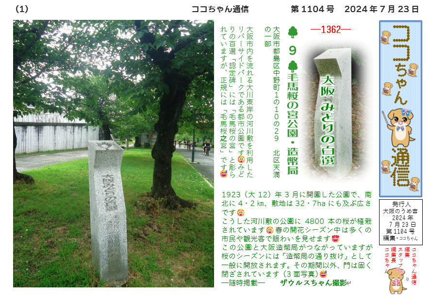 大阪市内を流れる大川東岸の河川敷を利用したリバーサイドパークである都市公園です😲みどりの百選「認定碑」には「毛馬桜の宮」と彫られていますが、正規には「毛馬桜之宮」です😅