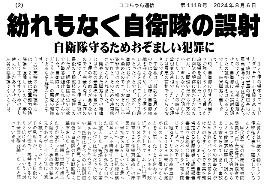 当初からおかしいなと思っていた」。「本来、日航機は横田基地に不時着するはずだった。しかし航路を外れて山中に激突した」「現場にあった第4エンジンは粉々だった。攻撃されないとああはならない」「政府はすべての証拠隠滅を図った」と発言。さらに「日航機は自衛隊のF4戦闘機に撃墜された」と語っています。