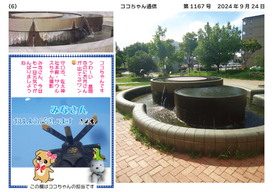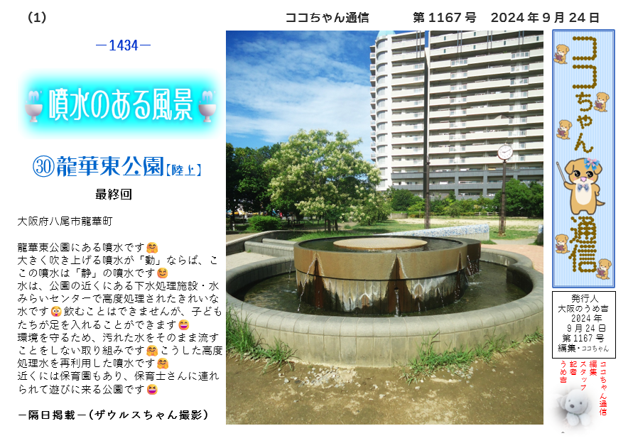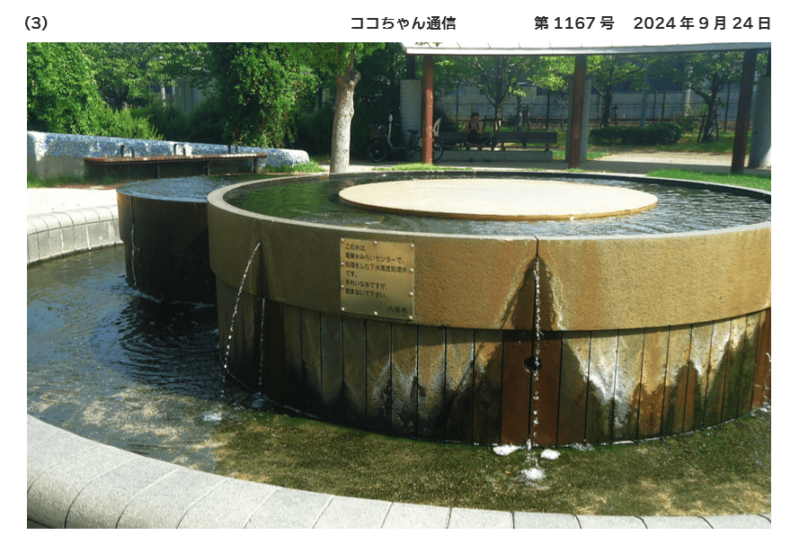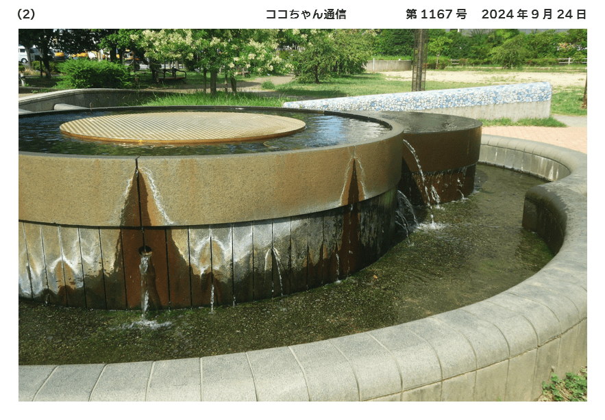 子どもたちは、外側の縁に座って足を水につけたり、中に入ったりするのですから、噴水の本体側はきれいに清掃してほしいですね😅
