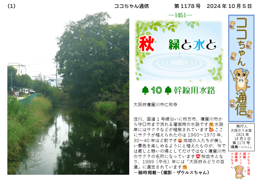 淀川、国道1号線沿いに枚方市、寝屋川市から守口市まで流れる灌漑用の水路です🤗水路岸にはサクラなどが植栽されています🥰ここにサクラが植えられたのは1960~1970年、30~40年ほど前です😄地域の人たちが美しい景色を楽しめるようにと植えたものが、今では癒しと憩いの場としてだけではなく寝屋川市のサクラの名所になっています😍桜並木となり、1989(平元)年には「大阪府みどりの百選」に選定されています🤗