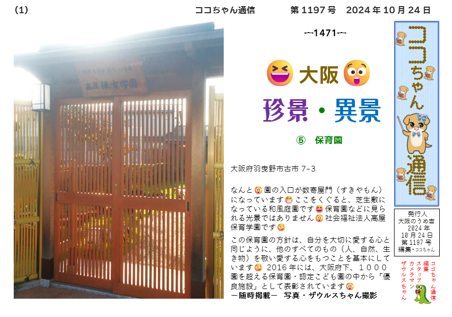 この保育園の方針は、自分を大切に愛する心と同じように、他のすべてのもの(人、自然、生き物)を敬い愛する心をもつことを基本にしています😏 2016年には、大阪府下、1000園を超える保育園・認定こども園の中から「優良施設」として表彰されています😲