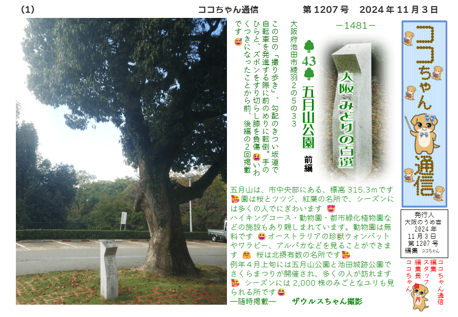 ハイキングコース・動物園・都市緑化植物園などの施設もあり親しまれています。動物園は無料です 😆オーストラリアの珍獣ウォンバットやワラビ-、アルパカなどを見ることができます 🤗 桜は北摂有数の名所です🥰 例年4月上旬には五月山公園と池田城跡公園でさくらまつりが開催され、多くの人が訪れます🥰 シーズンには2,000株のみごとなユリも見られる所です😆 ―随時掲載― ザウルスちゃん撮影