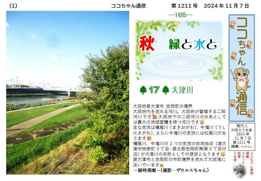 槇尾川、牛滝川の2つの支流の合流地点(泉大津市板原町3丁目・泉北郡忠岡町馬瀬3丁目付近)が大津川の名称としての源流となります😏泉大津市と忠岡町の市町境界を流れて大阪湾に注いでいます🤗 -随時掲載-(撮影・ザウルスちゃん)