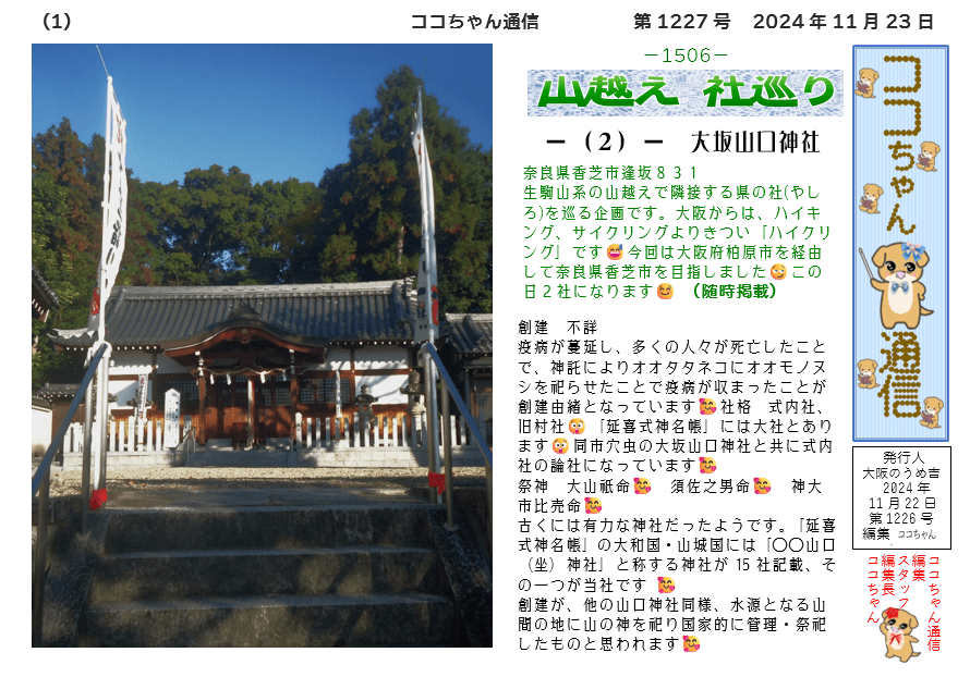古くには有力な神社だったようです。「延喜式神名帳」の大和国・山城国には「○○山口(坐)神社」と称する神社が15社記載、その一つが当社です 🥰