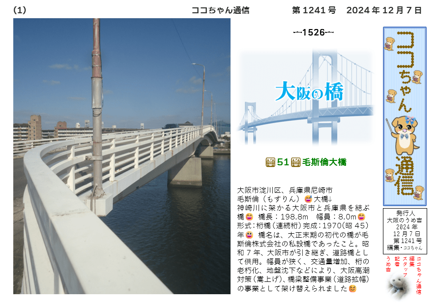 形式:桁橋(連続桁)完成:1970(昭45)年😃 橋名は、大正末期の初代の橋が毛斯倫株式会社の私設橋であったこと。昭和7年、大阪市が引き継ぎ、道路橋として供用。幅員が狭く、交通量増加、桁の老朽化、地盤沈下などにより、大阪高潮対策(嵩上げ)、橋梁整備事業(道路拡幅)の事業として架け替えられました☺️