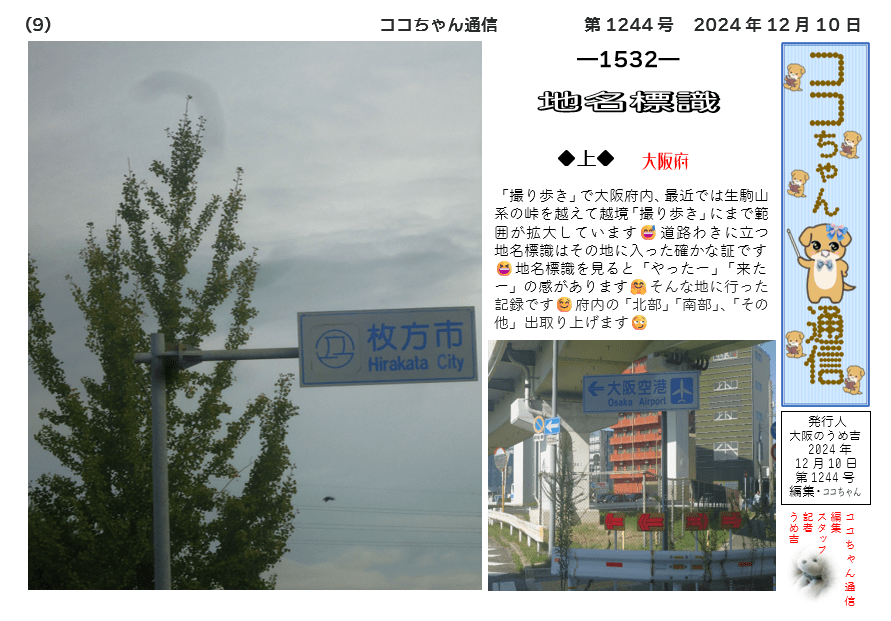 「撮り歩き」で大阪府内、最近では生駒山系の峠を越えて越境「撮り歩き」にまで範囲が拡大しています😅道路わきに立つ地名標識はその地に入った確かな証です😆地名標識を見ると「やったー」「来たー」の感があります🤗そんな地に行った記録です☺️府内の「北部」「南部」、「その他」出取り上げます😏