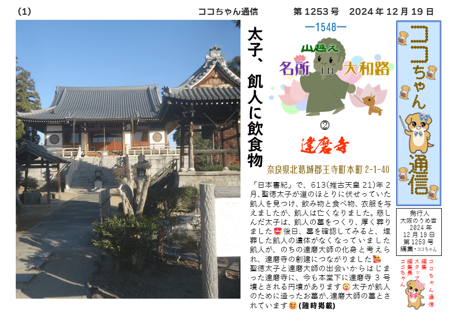 「日本書紀」で、613(推古天皇21)年2月、聖徳太子が道のほとりに伏せっていた飢人を見つけ、飲み物と食べ物、衣服を与えましたが、飢人は亡くなりました。悲しんだ太子は、飢人の墓をつくり、厚く葬りました😍後日、墓を確認してみると、埋葬した飢人の遺体がなくなっていました飢人が、のちの達磨大師の化身と考えられ、達磨寺の創建につながりました🥰
