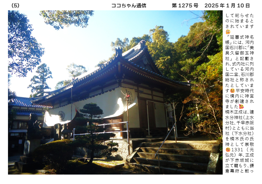 楠木正成は、建水分神社(上水分社、千早赤阪村)とともに当社(下水分社)を楠木氏の氏神として崇敬😋1331 (元弘元) 年、正成が下赤坂城に立て籠もり、鎌倉幕府と戦った