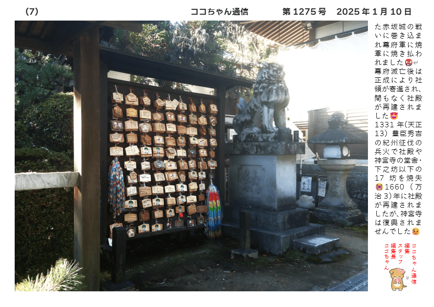 た赤坂城の戦いに巻き込まれ幕府軍に焼軍に焼き払われました🤬幕府滅亡後は正成により社領が寄進され、間もなく社殿が再建されました😍 1331年(天正13) 豊臣秀吉の紀州征伐の兵火で社殿や神宮寺の堂舎・下之坊以下の17坊を焼失😭1660 (万治3)年に社殿が再建されましたが、神宮寺は復興されませんでした😣