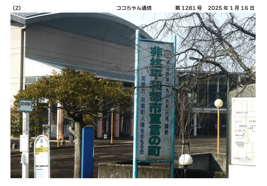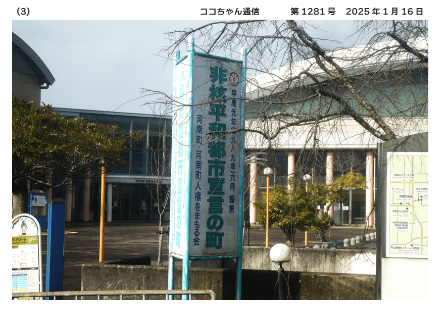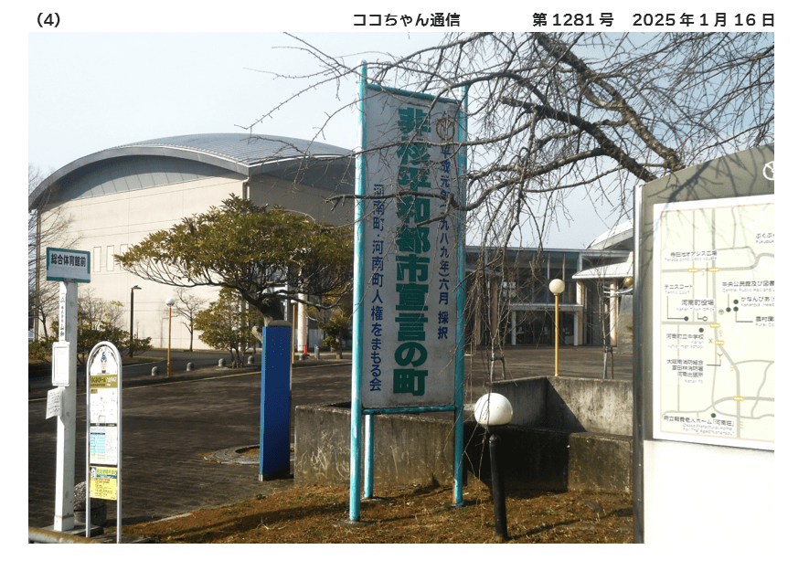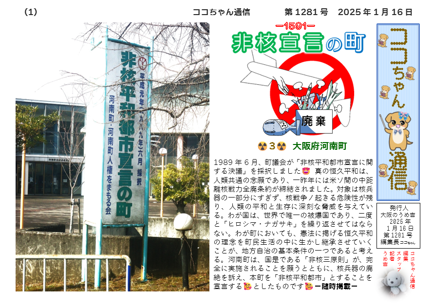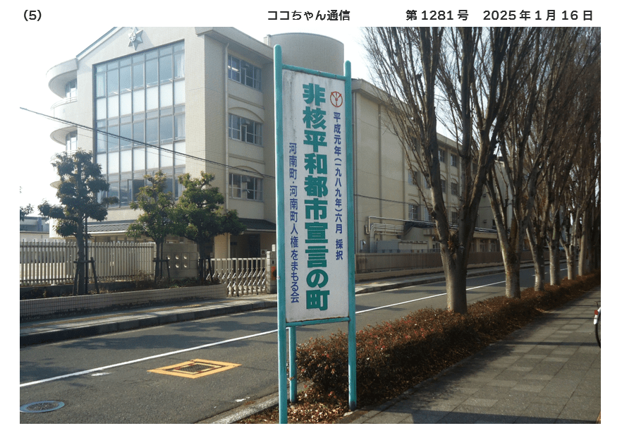 1989年6月、町議会が「非核平和都市宣言に関する決議」を採択しました😍 真の恒久平和は、人類共通の念願であり、一昨年には米ソ間の中距離核戦力全廃条約が締結されました。対象は核兵器の一部分にすぎず、核戦争ノ起きる危険性が残り、人類の平和と生存に深刻な脅威を与えている。わが国は、世界で唯一の被爆国であり、二度と「ヒロシマ・ナガサキ」を繰り返させてはならない。わが町においても、憲法に掲げる恒久平和の理念を町民生活の中に生かし継承させていくことが、地方自治の基本条件の一つであると考える。河南町は、国是である「非核三原則」が、完全に実施されることを願うとともに、核兵器の廃絶を訴え、本町を「非核平和都市」とすることを宣言する🥰としたものです🥰-随時掲載-