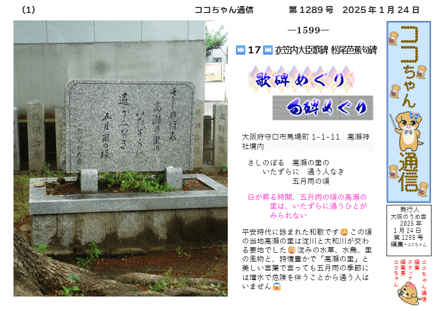 平安時代に詠まれた和歌です😏この頃の当地高瀬の里は淀川と大和川が交わる要地でした😲淀みの水草、水鳥、里の風物と、詩情豊かで「高瀬の里」と美しい言葉で言っても五月雨の季節には増水で危険を伴うことから通う人はいません😱