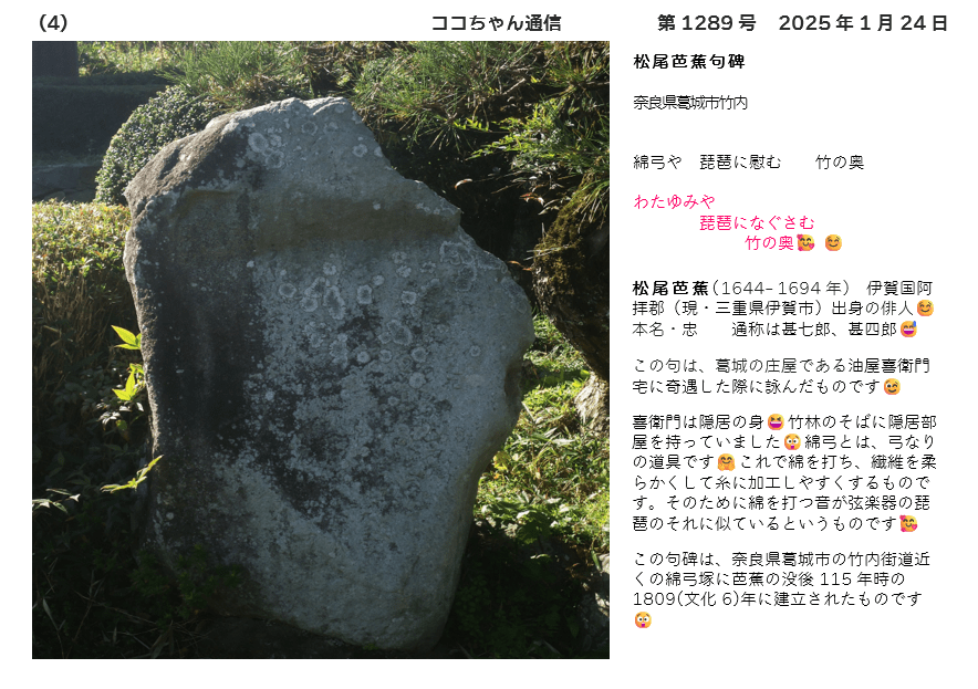 この句碑は、奈良県葛城市の竹内街道近くの綿弓塚に芭蕉の没後115年時の1809(文化6)年に建立されたものです😲