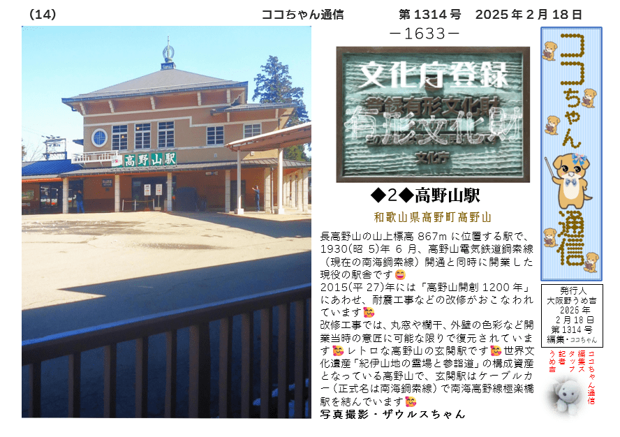 改修工事では、丸窓や欄干、外壁の色彩など開業当時の意匠に可能な限りで復元されています🥰レトロな高野山の玄関駅です🥰世界文化遺産「紀伊山地の霊場と参詣道」の構成資産となっている高野山で、玄関駅はケーブルカー(正式名は南海鋼索線)で南海高野線極楽橋駅を結んでいます🥰 写真撮影・ザウルスちゃん