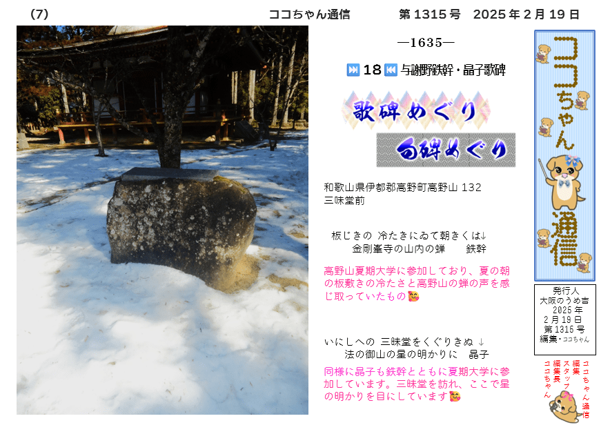 1. asamoyosiさん、こんにちは。いつも有難うございます🙇‍♂️高野山の歌碑めぐり、いいですね🤗今回行けなかった奥の院の方だけでも、パンフレットを見ると7カ所もあります😆パンフレットに載っていないものがあるかもしれないです😉