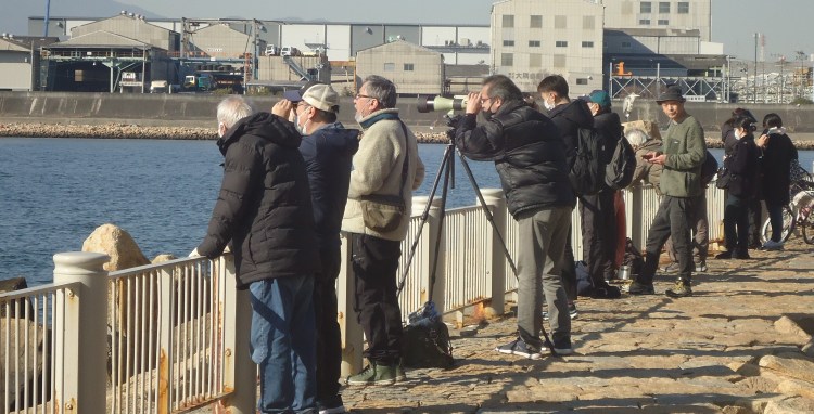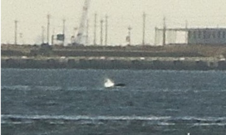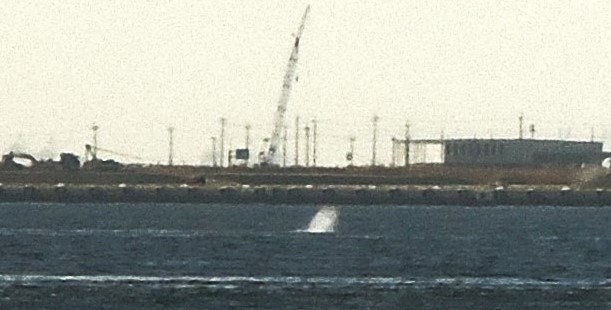 対岸は、西淀川区の矢倉緑地です。ここに報道のカメラが入り、クジラさんを見ようと市民らが集っていました。上空には報道ヘリコプターが飛んでいました。クジラさんは時折潮を噴き上げています。