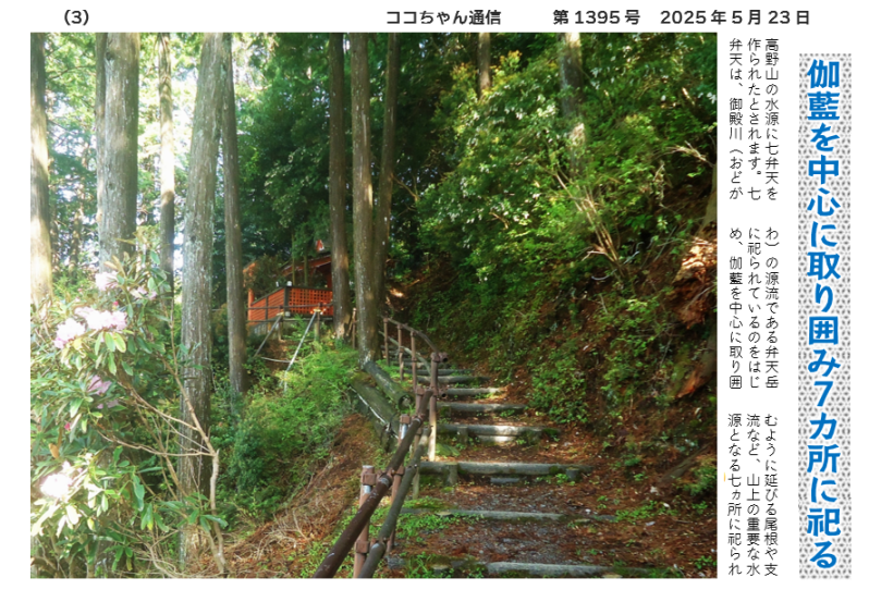 高野山の水源に七弁天を作られたとされます。七弁天は、御殿川(おどがわ)の源流である弁天岳に祀られているのをはじめ、伽藍を中心に取り囲むように延びる尾根や支流など、山上の重要な水源となる七ヵ所に祀られ