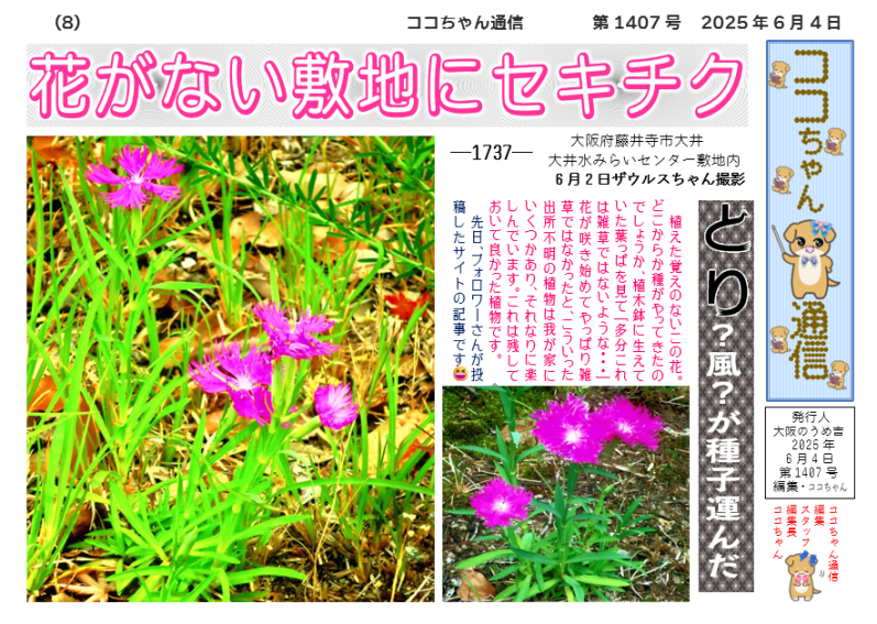 同センターの敷地に花壇などはありません。にもかかわらず、水辺のエリアにセキチクの花が咲いていました 😃たぶん、鳥さんが運んできたのか、風に吹かれて種子が飛んできて発芽したものでしよう 😅雑草に混じってきれいな花を咲かせていました 😆