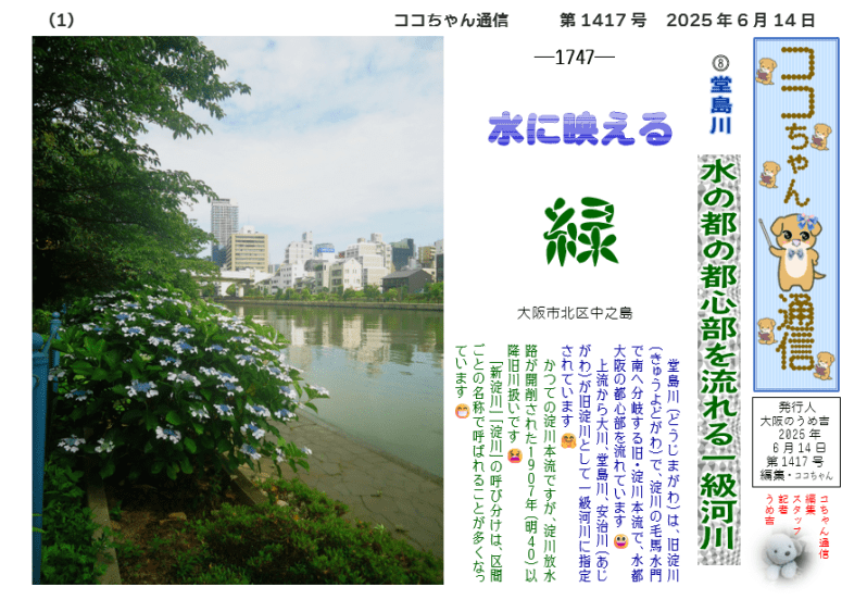 堂島川(どうじまがわ)は、旧淀川(きゅうよどがわ)で、淀川の毛馬水門で南へ分岐する旧・淀川本流で、水都大阪の都心部を流れています 😃