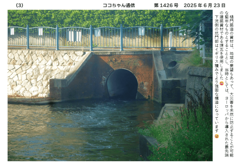樋門築造の資材は、地域の要望もあって、大災害を未然に防止することが可能な堅牢なものとすることとし、当時としては、ヨーロッパから導入された最先端の建築資材である煉瓦を使用しました 😄
