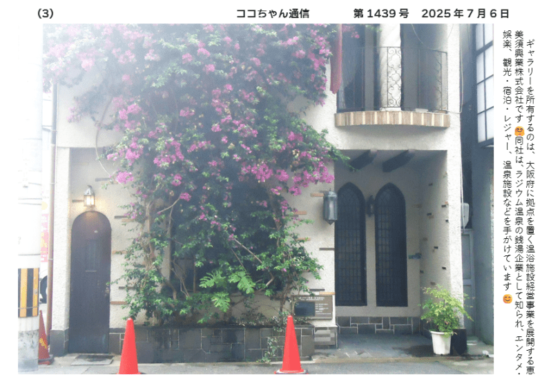 ギャラリーを所有するのは、大阪府に拠点を置く温浴施設経営事業を展開する恵美須興業株式会社です 🤗同社は、ラジウム温泉の銭湯企業として知られ、エンタメ・娯楽、観光・宿泊・レジャー、温泉施設などを手がけています 😊
