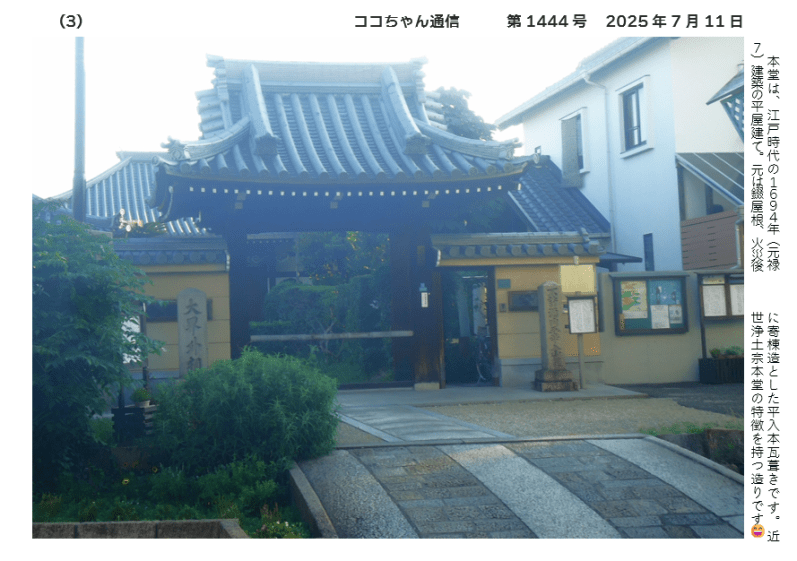 本堂は、江戸時代の1694年(元禄7)建築の平屋建て。元は錣屋根、火災後に寄棟造とした平入本瓦葺きです。近世浄土宗本堂の特徴を持つ造りです😄
