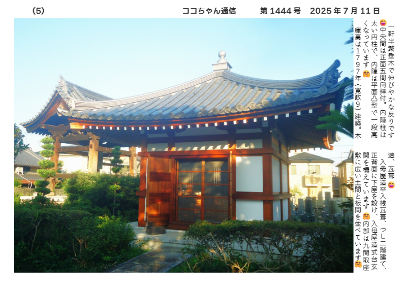 一軒半繁垂木で伸びやかな反りです 😄中央間は正面五間向拝付。内陣柱は太い円柱で、内陣は平面凸型で一段高くなっています 🤗庫裏は1797年(寛政9)建築。木造、瓦葺 😄