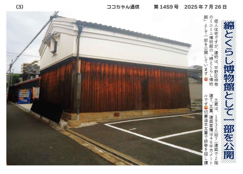 個人住宅ですが、建物は、平野区特有のミニミニ博物館の「綿とくらし博物館」として一部を公開しています 😃