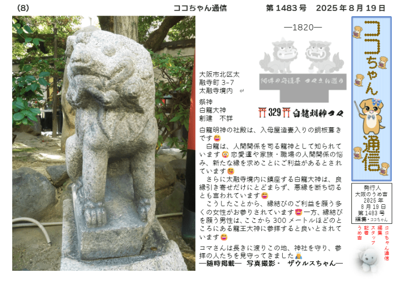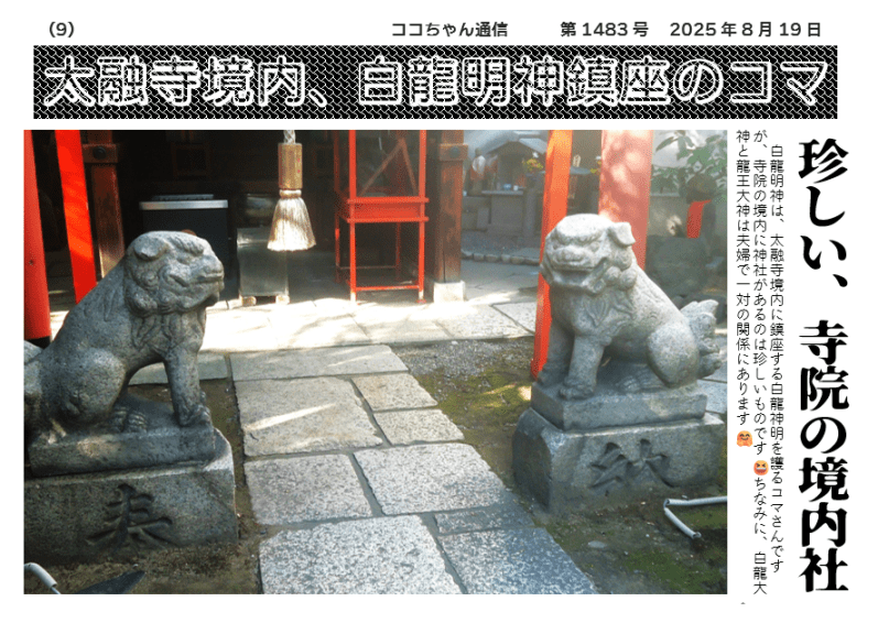 白龍明神は、太融寺境内に鎮座する白龍神明を護るコマさんですが、寺院の境内に神社があるのは珍しいものです 😆ちなみに、白龍大神と龍王大神は夫婦で一対の関係にあります 🤗