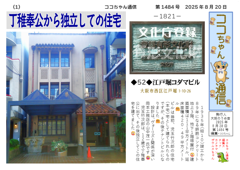 ビルは、鉄筋コンクリートの耐火構造だったことと、裏側が江戸堀川であったことから大阪大空襲での戦火から逃れました 😃