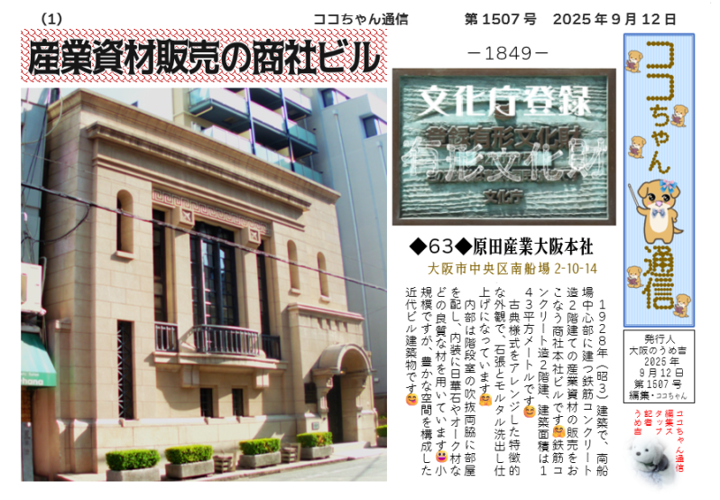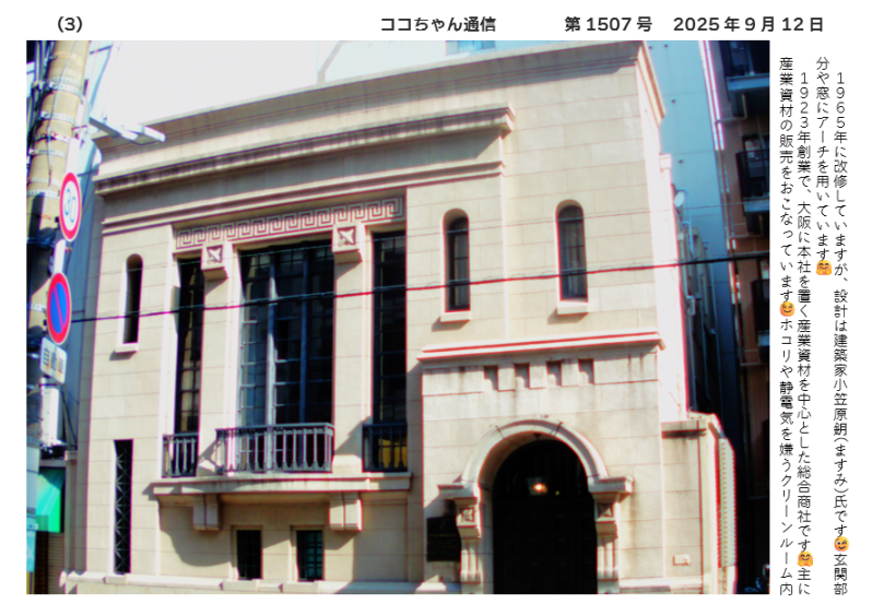 1928年(昭3)建築で、南船場中心部に建つ鉄筋コンクリート造2階建ての産業資材の販売をおこなう商社本社ビルです🤗鉄筋コンクリート造2階建、建築面積は143平方メートルです☺️