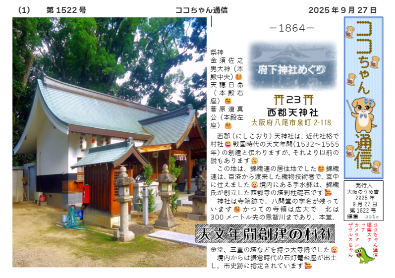大阪のうめ吉様 おはようございます。「にしこおり」と言えば、富田林市に同じ読み方の錦織神社や錦織公園がありますよね。いつも通る道沿いにあるのですが、まだ訪れたことはありません。八尾市にも字こそ違え同じ神社があるのは興味深いですね。機会があれば富田林の方の神社に行って見ようと思います。☺️