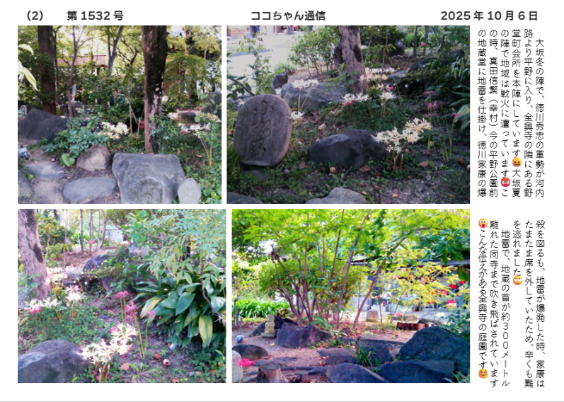 大坂冬の陣で、徳川秀忠の軍勢が河内路より平野に入り、全興寺の隣にある野堂町会所を本陣にしています😖大坂夏の陣で地域は戦火に遭っています😡この時、真田信繁(幸村)今の平野公園前の地蔵堂に地雷を仕掛け、徳川家康の爆殺を図るも、地雷が爆発した時、家康はたまたま席を外していたため、辛くも難を逃れました🙄