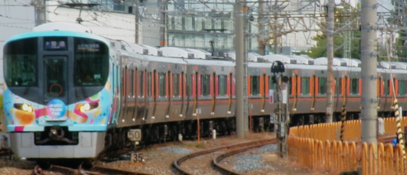 さらに、車両は323系に特化されている異色の路線です。これに装飾を施したラッピング車が、エキスポライナー「JRWESTparadetrain」として走っています😄