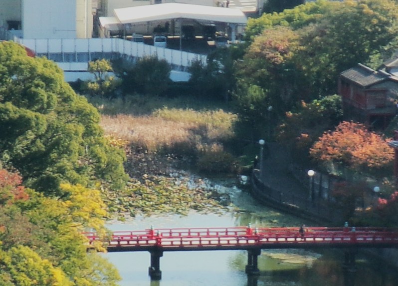 池に真っ赤な朱色の橋、いいですね😉朱色の橋は、水面との相性が最高です。その相乗効果で橋と水面(池)の両方を引き立たせています😆
